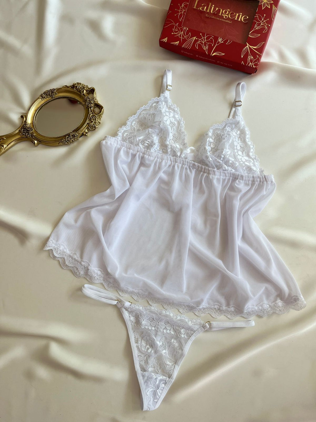 Delicado y seductor set de lencería que combina encaje floral y tul transparente para un...