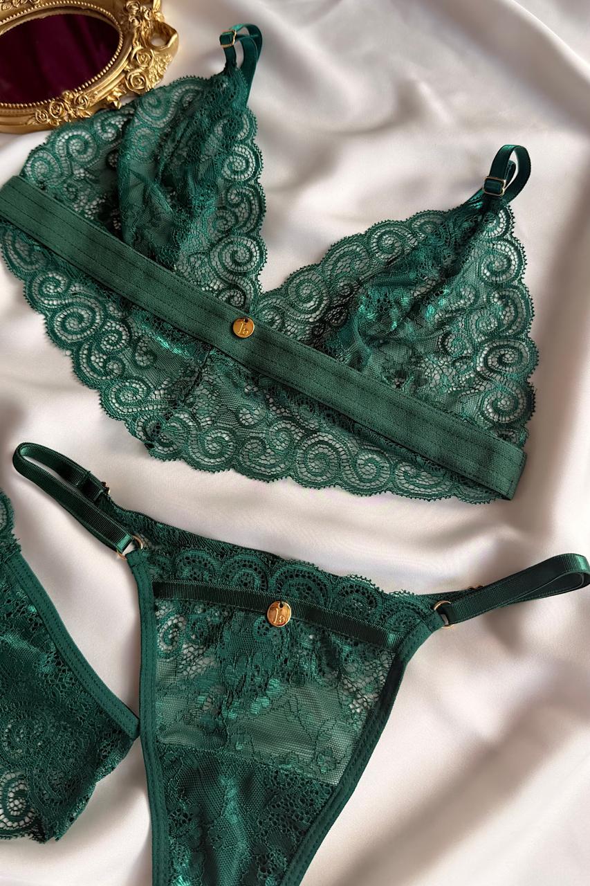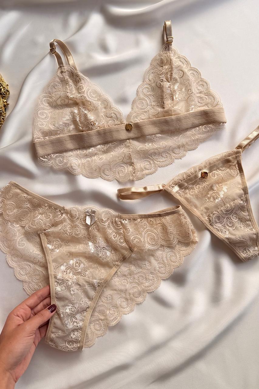 Set de lencería de encaje que incluye un bra, un hilo y un cachetero. Hecho...
